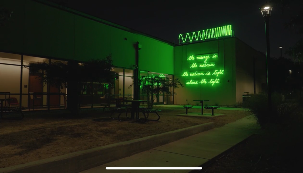 Austin, Texas-based artist duo Betelhem Makonnen and Adrian Aguilera describe their neon artwork, untitled (in the beginning was the photon), as highlighting “the inherent link between light waves (composed of photons) and communication, spotlighting communication’s power to go beyond imparting information to profoundly shaping our perception of the world and ourselves in it.” The artwork is installed on the exterior of Texas State University’s Live Oak Hall, the film and television building. The use of neon script references a long line of minimalist and light artists who have also used this commercial medium in artistic expression.